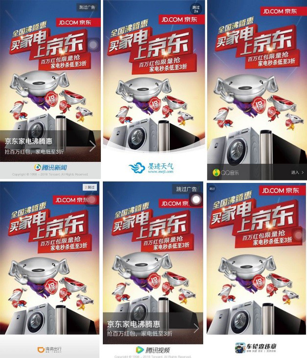 多年来,B2C电商大战的主角在营销投放上都不惜血本,只求全方位包围消费者,以形成洗脑般的攻势。笔者今天突然发现京东家电的广告占领了包括新闻、社交、出行、天气、娱乐等几乎所有APP的开机画面。不仅如此,传统PC端网站如搜狐视频、腾讯视频也被全面覆盖。强势“霸屏”的背后是“买家电上京东”的口号与京东家电四侠的形象的大规模曝光。